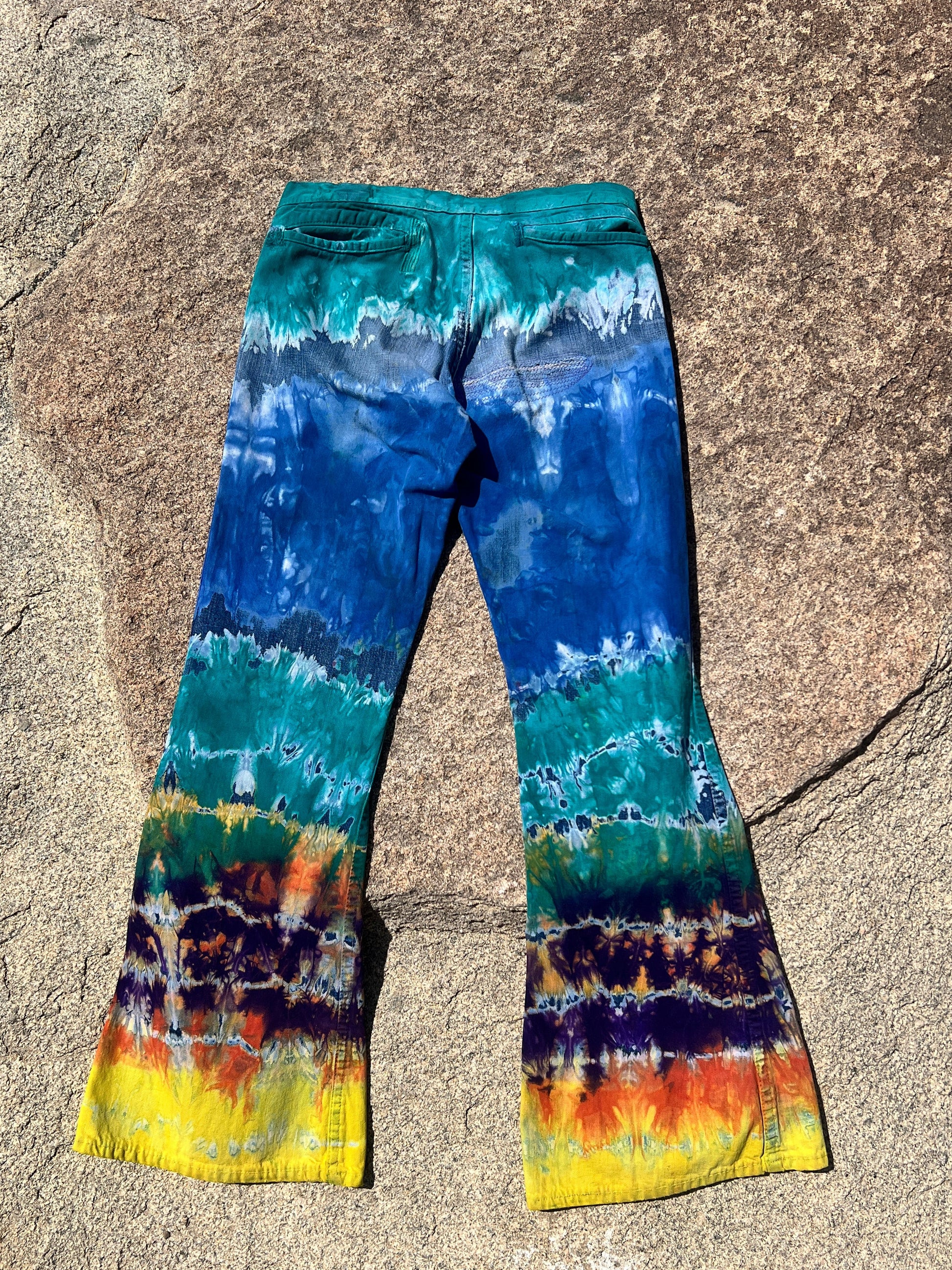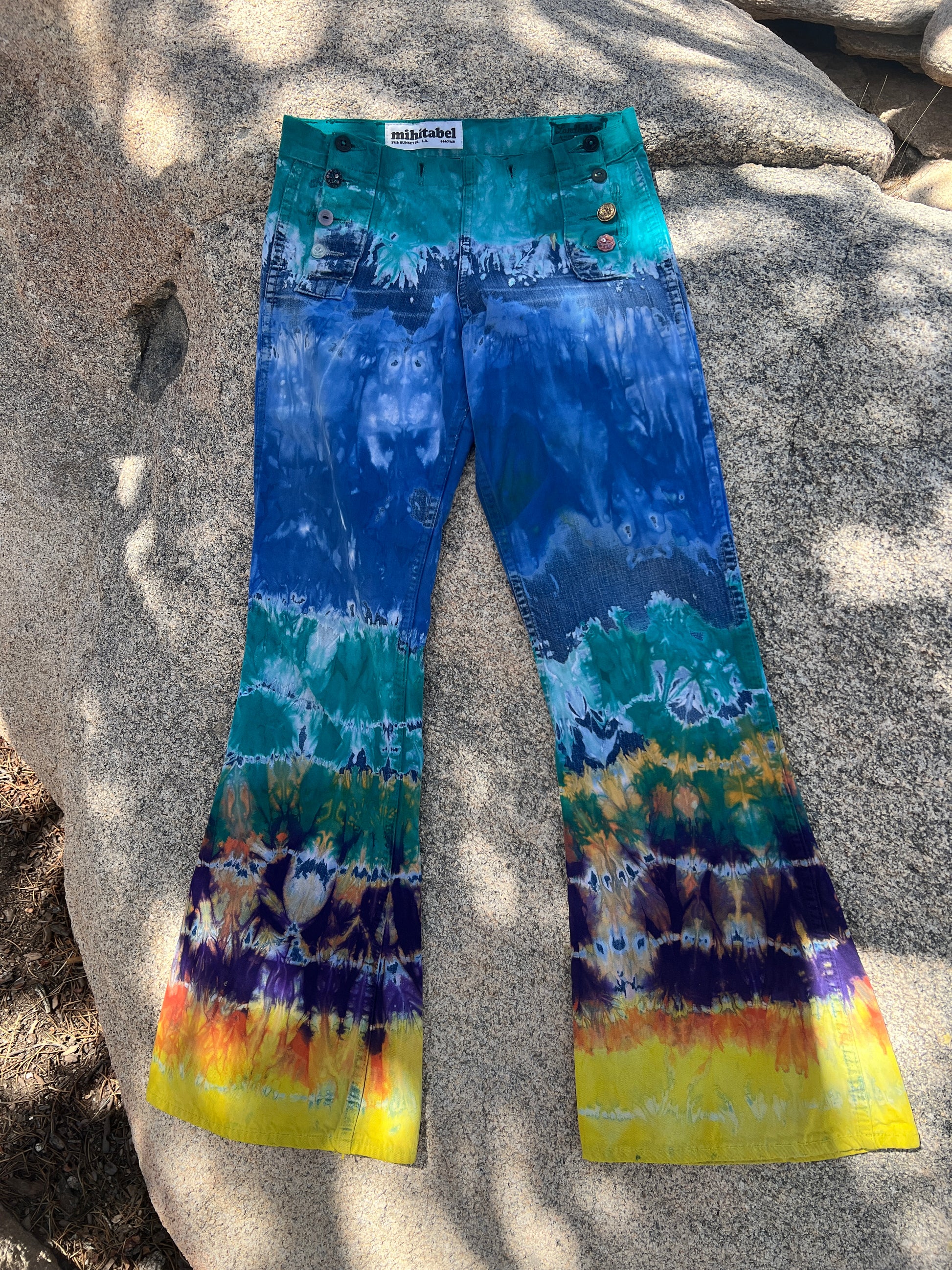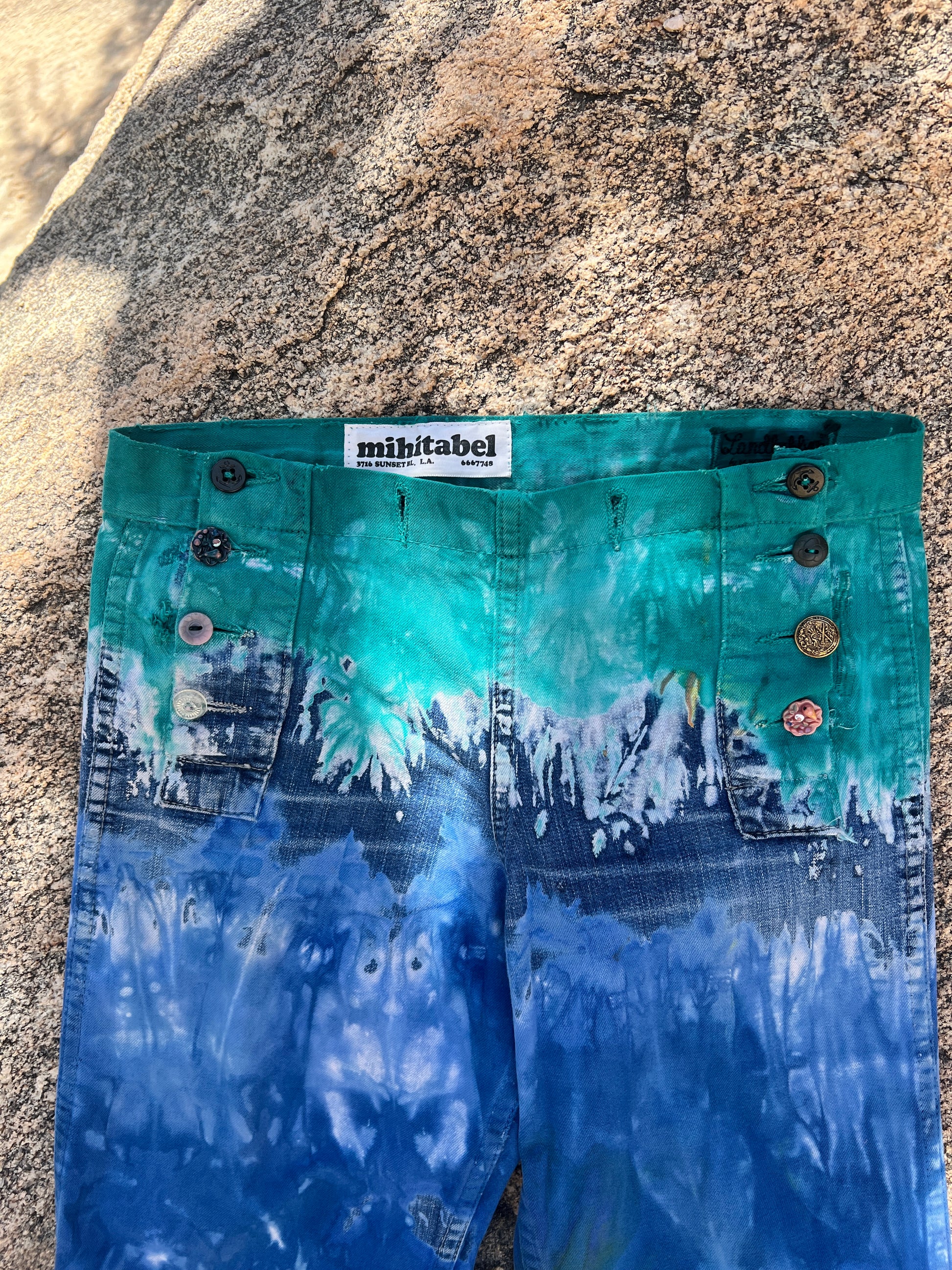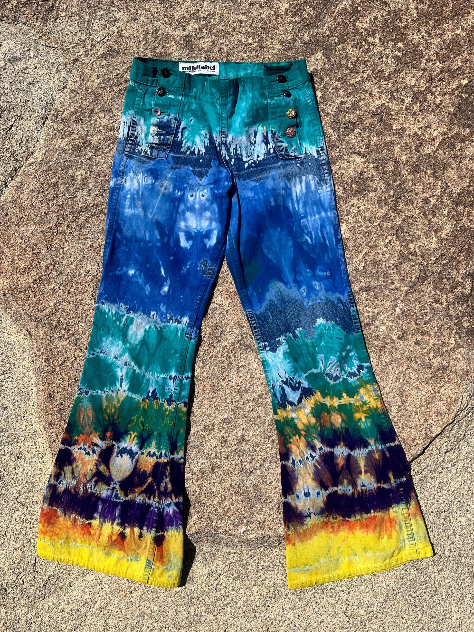 These Vintage Mihitabel Landlubber Jeans are hand-dyed in the 1960s by Carolyn Lee at her legendary Sunset Boulevard custom shop, Mihitabel. Known as “LA’s Queen of Tie-Dye,” Carolyn created wearable art that captivated the era’s most iconic musicians.