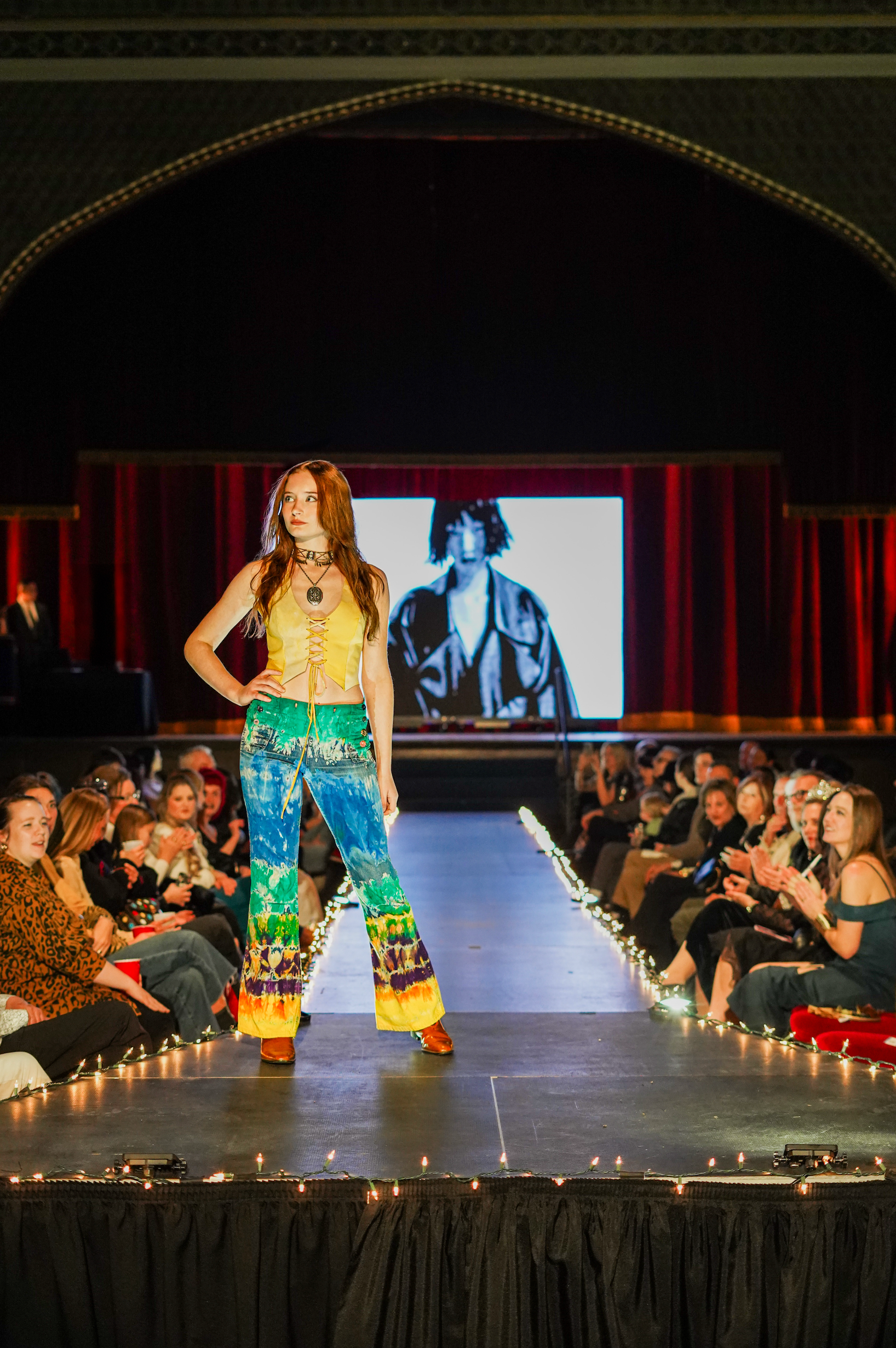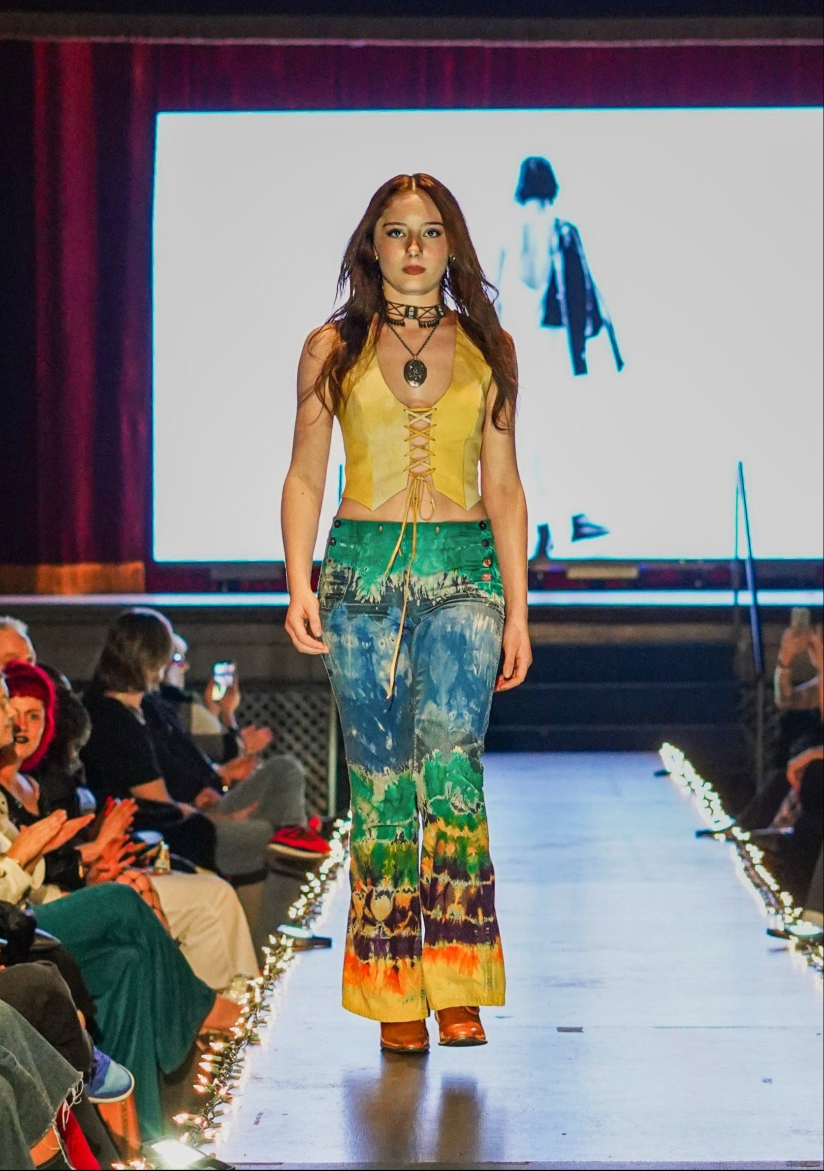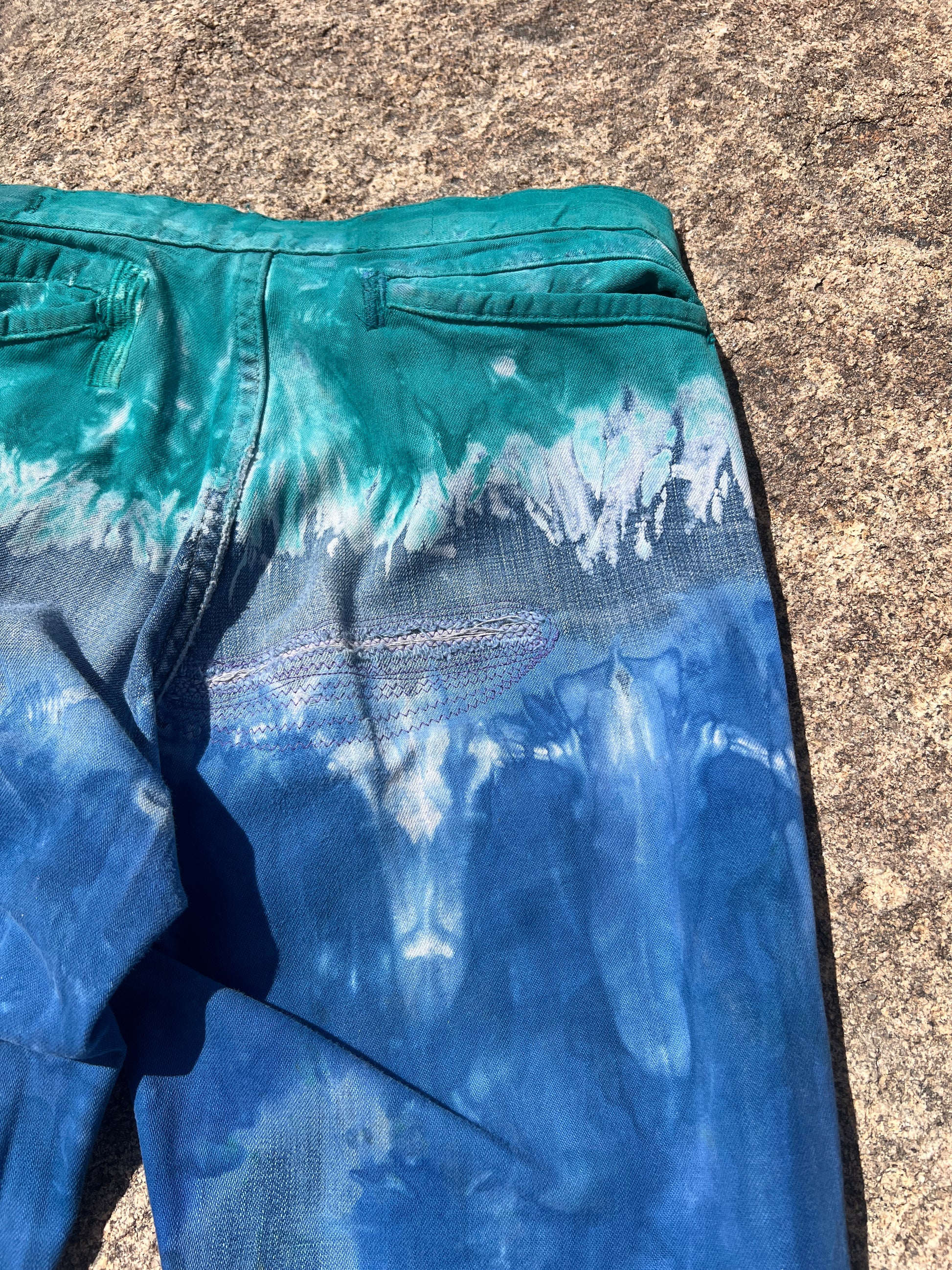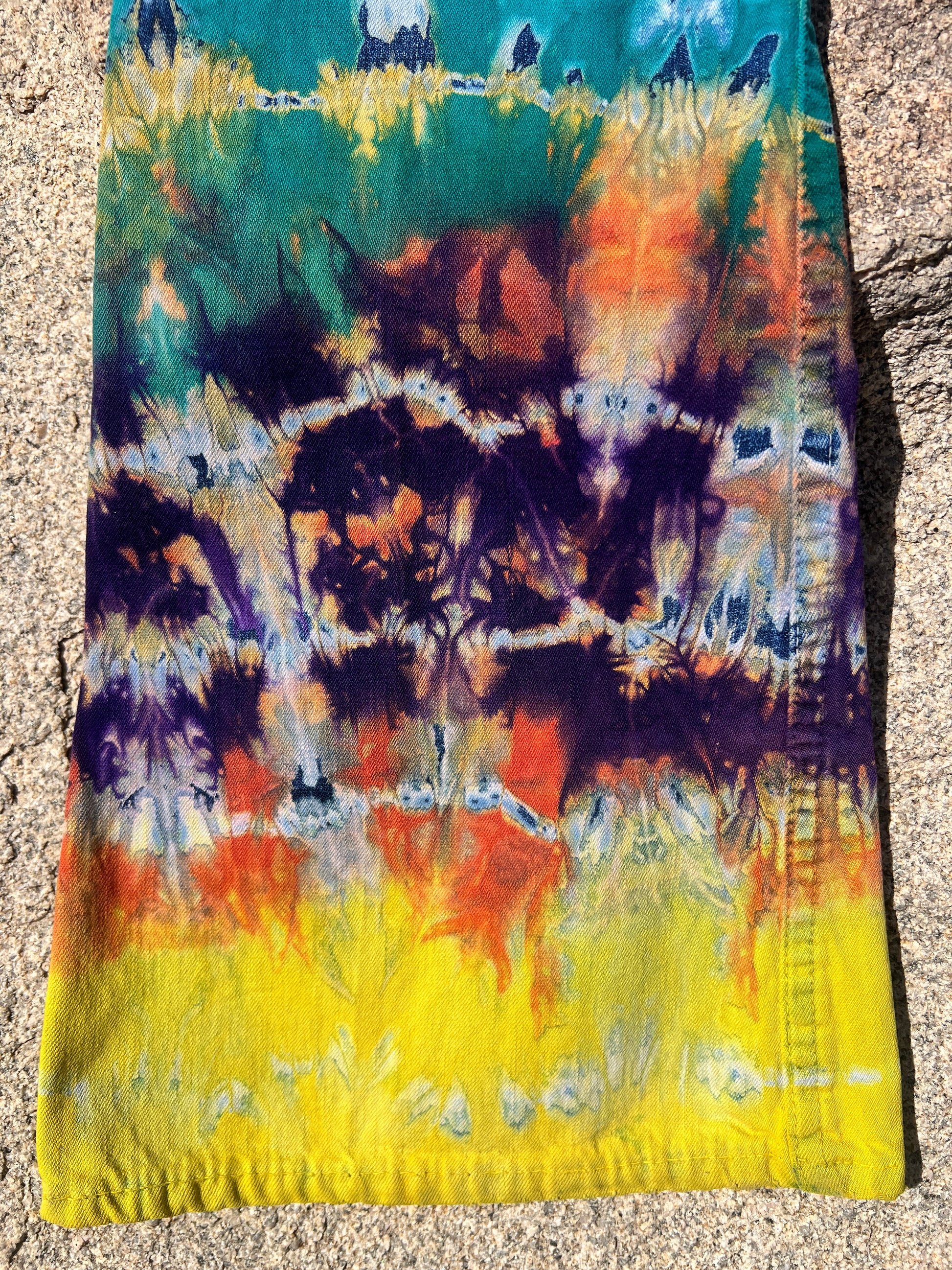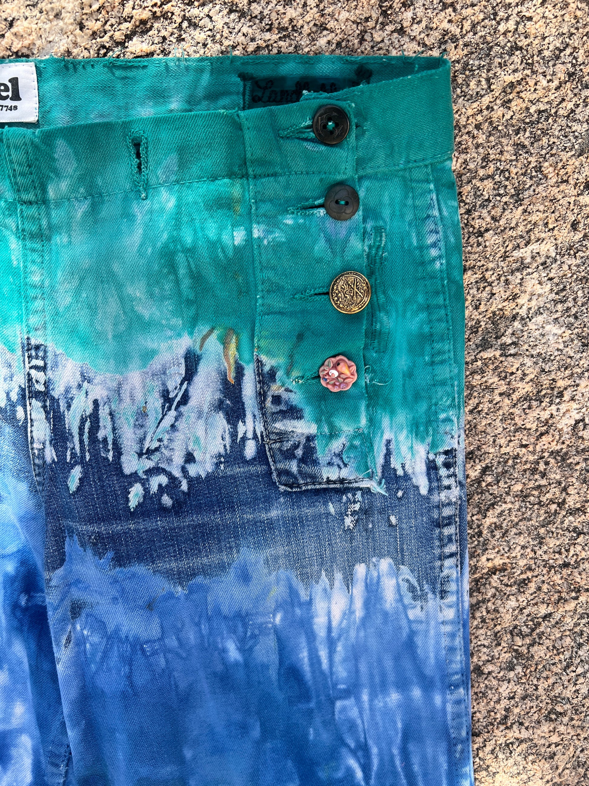 These Vintage Mihitabel Landlubber Jeans are hand-dyed in the 1960s by Carolyn Lee at her legendary Sunset Boulevard custom shop, Mihitabel. Known as “LA’s Queen of Tie-Dye,” Carolyn created wearable art that captivated the era’s most iconic musicians.